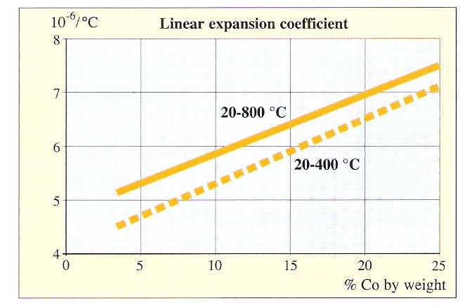 در حالیکه WCضریب انبساط خطی بسیار پائینی دارد اما برای سمنتت کاربایدهای WC-CO تقریبا نصف فولادهای فریتی و مارتنزتی و برای فولادهای آستنیتی این نسبت حدود 1:3 می باشد.