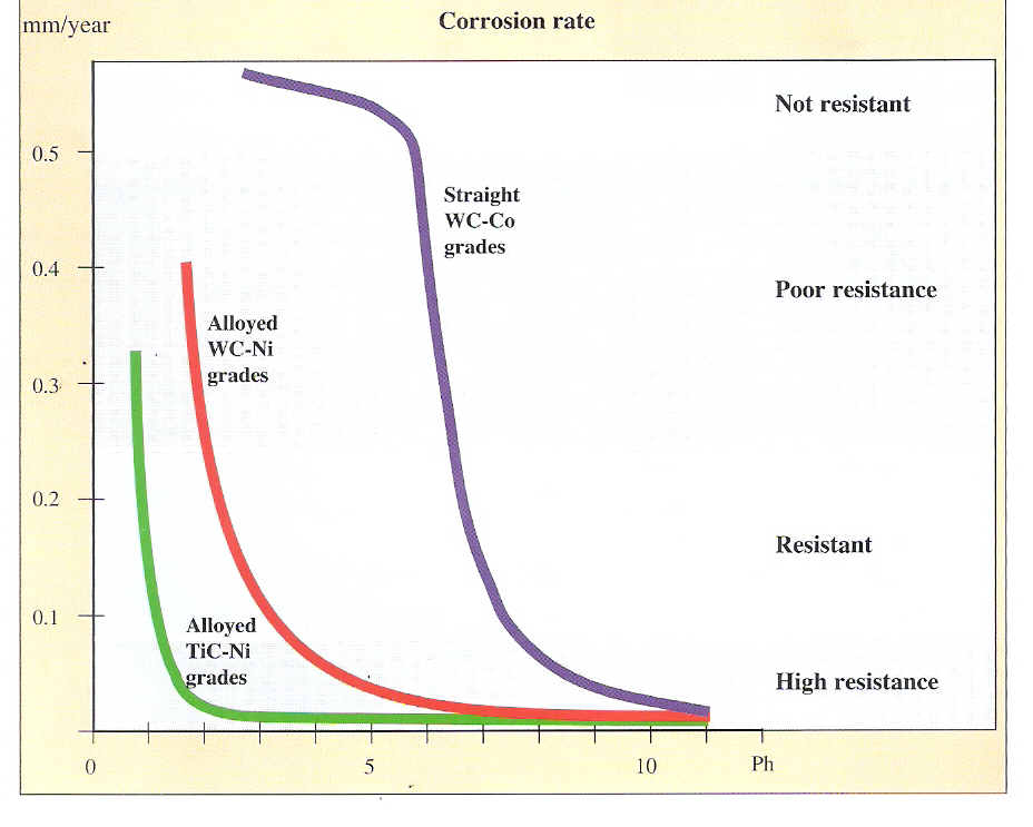 به صورت نشانداده شده در دیاگرام ، گریدهای خالص WC-Co مقاومت پائینی به PH7 دارند.